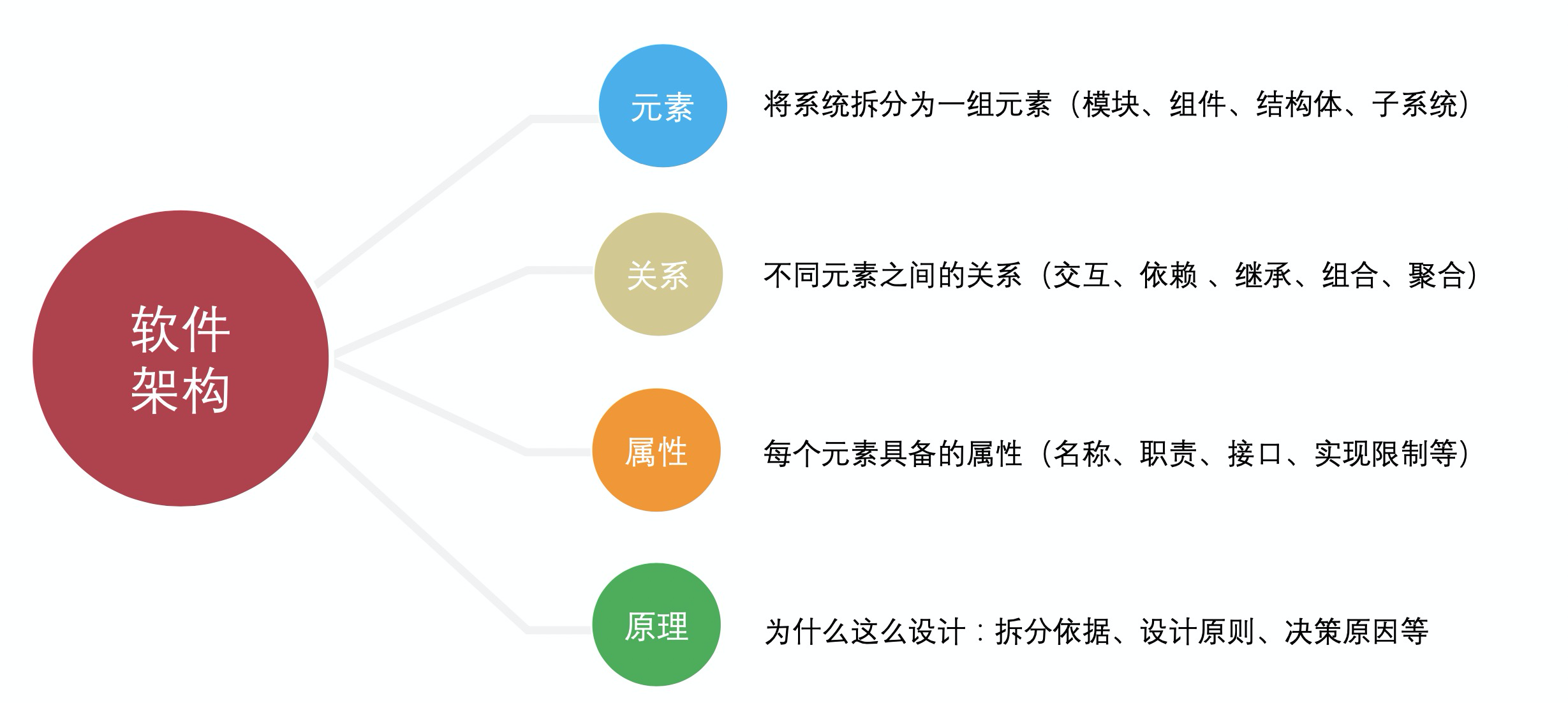 综合上述各种权威定义,软件系统的架构通常需要包含如下四类核心要素: