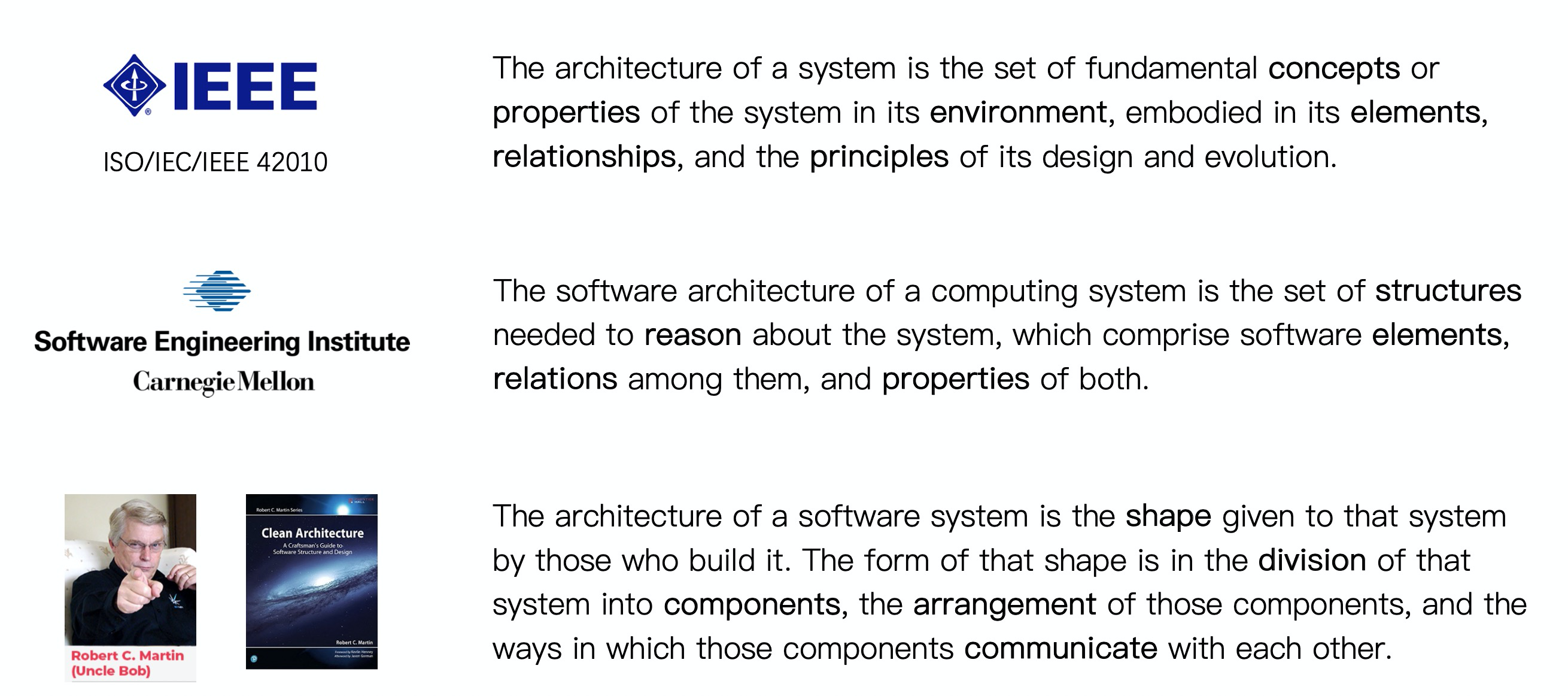 IEEE 给出的定义:架构是环境中该系统的一组基础概念(concepts)和属性(properties),具体表现就是它的元素(elements)、关系(relationships),以及设计与演进的基本原则(principles)。