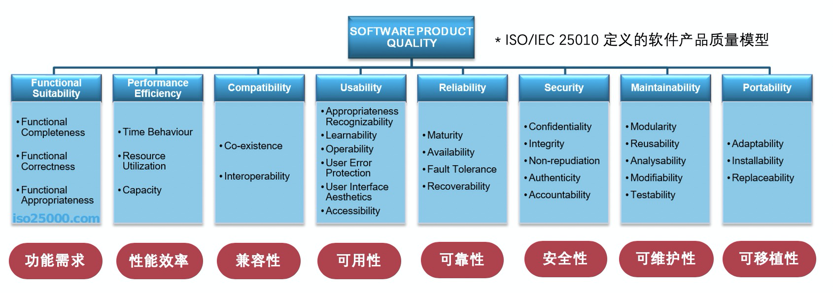 如何衡量一个软件产品的质量?上图是 ISO/IEC 25010 标准定义的软件产品质量模型,包括以下 8 个大类: