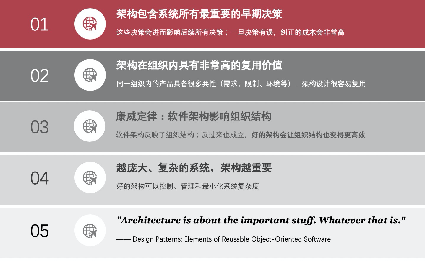 - 是不是越听越糊涂,仿佛架构有无数种诠释和意义?不必过于纠结,按照GoF的设计模式所述:Architecture is about the important stuff. Whatever that is. 对,管它是啥,记住架构很重要就够了。