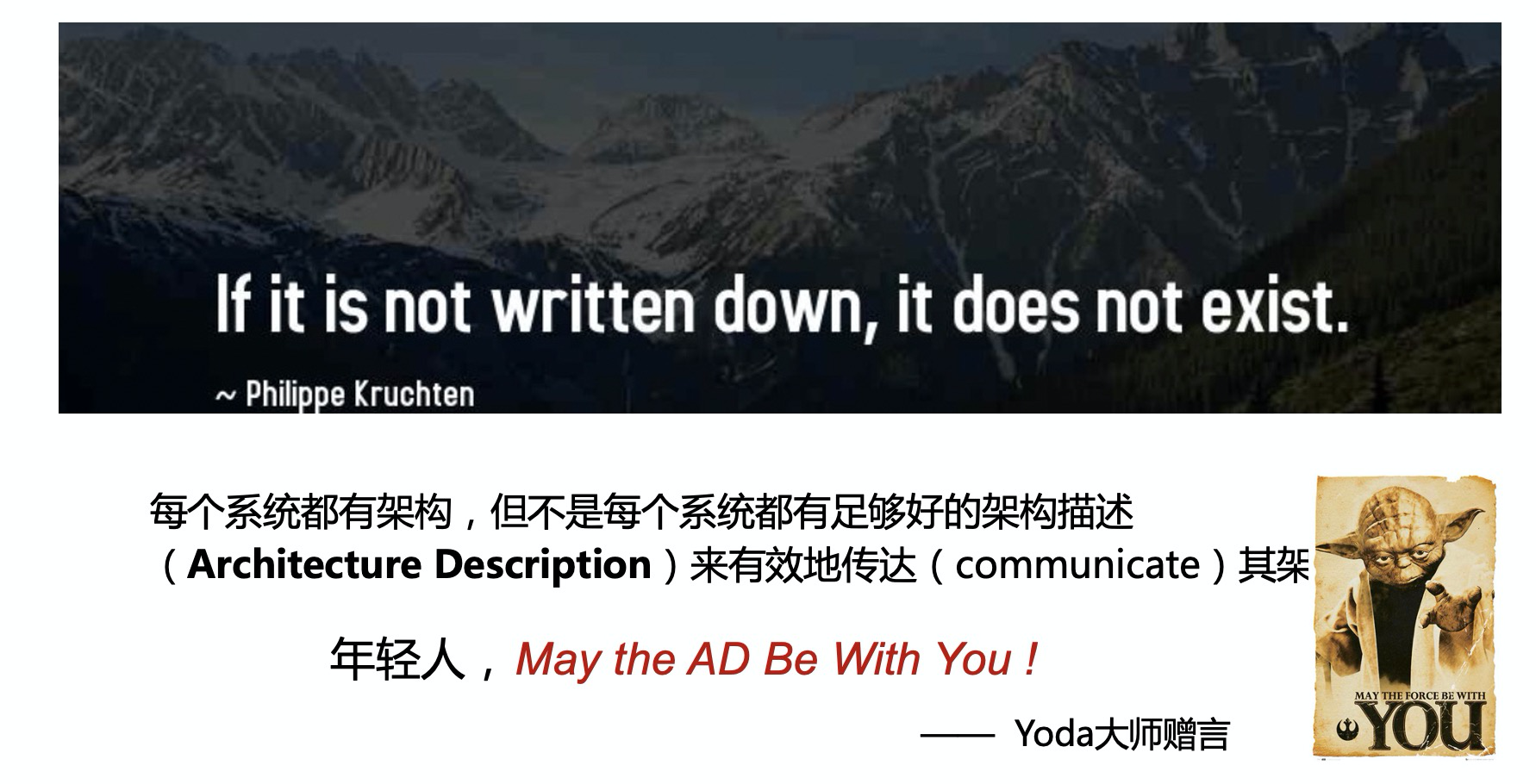 有了良好的架构设计,万里长征之路就已经走了一大半。就像是青年导演第一次遇上好剧本,心潮澎湃两眼放光,仿佛已经预见了电影上映后的票房盛况。当然,剩下的一小半路,并不会如想象中那么平坦 —— 同样的剧本,不同导演拍出来会有质一样的区别。好的“最佳导演”,即使面对不是“最佳剧本”的剧本,也有能力拍出“最佳影片”。同样,好的架构师,也应该有能力描述好一个不错的架构设计;即使做不到为精彩的内容加分,也不应该因为形式上没描述好而丢分,否则就会像高考作文丢了卷面分一样憋屈和心酸。