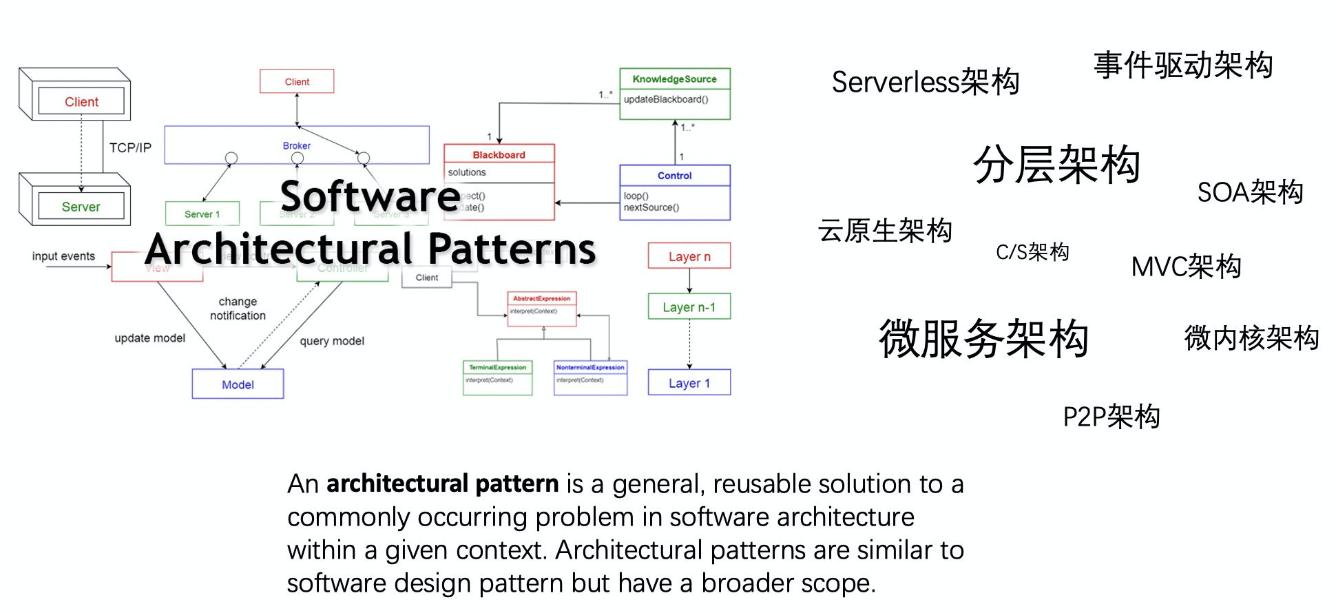 架构模式(architectural patterns)与我们常讨论的设计模式(design patterns)并不是一码事,但如果仅从“模式”这个角度去解读,两者的理念都是一致的:针对给定上下文中经常出现的问题的通用、可复用的解决方案。最主要的区别在于,架构模式会更高维抽象和偏全局整体(毕竟是运用在架构设计层面)。