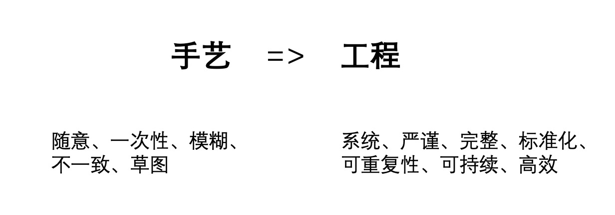 讨论具体的制图方法和工具前,我们需要先竖立清晰的制图目标。工具是人类进化的阶梯,但如果理解和利用不当,则很容易反过来被工具所限制甚至奴役,忘了最初发明和使用工具的初心。对于架构制图而言,已经有那么多形形色色的方法与工具,使用它们的初心是什么呢?我认为本质上都是想把制图这个过程从一门自由的手艺变成一项科学的工程:系统、严谨、完整、标准化,同时能做到可重复、可持续和高效。