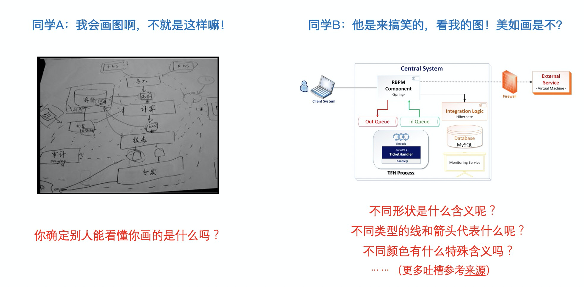 看到这里,屏幕前的你又轻蔑一笑:哼,显然没这么简单。确实,道理说出来大家都懂,架构制图与工程制图一样,都是一件需要下功夫认真严谨对待的事情。但现实中大部分人还真没这工夫去下那功夫,比如上面贴的两幅很常见的架构图。第一张图不用多说,这种草图自己涂涂抹抹挺好,但拿出来见人就是你的不对了。那第二张图呢,看上去似乎还挺像那么回事的?并不是,如果你更仔细地去揣摩,就能发现这张图底下所隐藏的很多模糊和不严谨之处(可参考这张图的来源文章:The Art of Crafting Architectural Diagrams)。