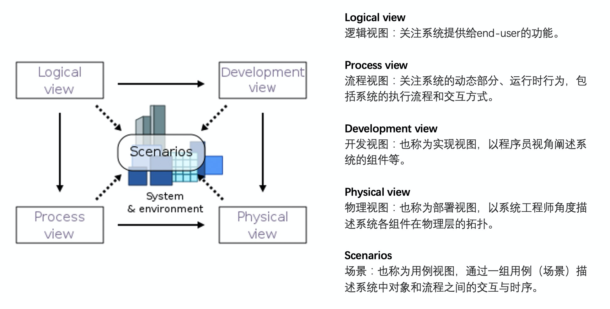 所以,“4+1”到底是指什么?让我们来 Wiki 一下:“4+1”是一种视图模型(view model),可以通过多种共存的视图描述软件密集型系统的架构。这些视图基于不同项目干系人(利益相关者)的视点(viewpoint),例如:终端用户、开发者、系统工程师和项目经理。“4+1”由 4 种基础视图和一些经过挑选的用例或场景(即额外的“+1”视图)组成,各自的具体含义如下: