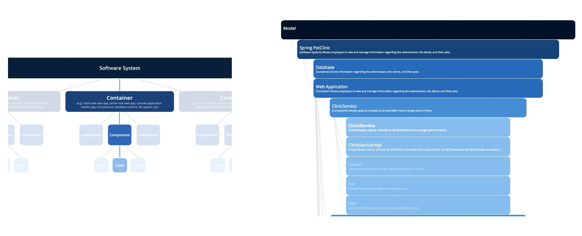上面的左图展示了 C4 模型中各层次抽象之间的映射关系:1 个软件系统由 1~N 个容器组成,1 个容器由 1~N 个组件组成,1 个组件由 1~N 个代码结构组成。右图是以简单的 Spring PetClinic 项目为例,演示了一个真实软件系统在 C4 模型下的层次结构:最上层就是 PetClinic 软件系统,它可以拆分为数据库、Web 应用等几个容器;Web 应用又可以进一步拆分出 ClinicService 这个组件,而这个组件下又包含了 ClinicService 接口类、ClinicServiceImple 实现类、Owner / Pet / Visit 等领域对象类。