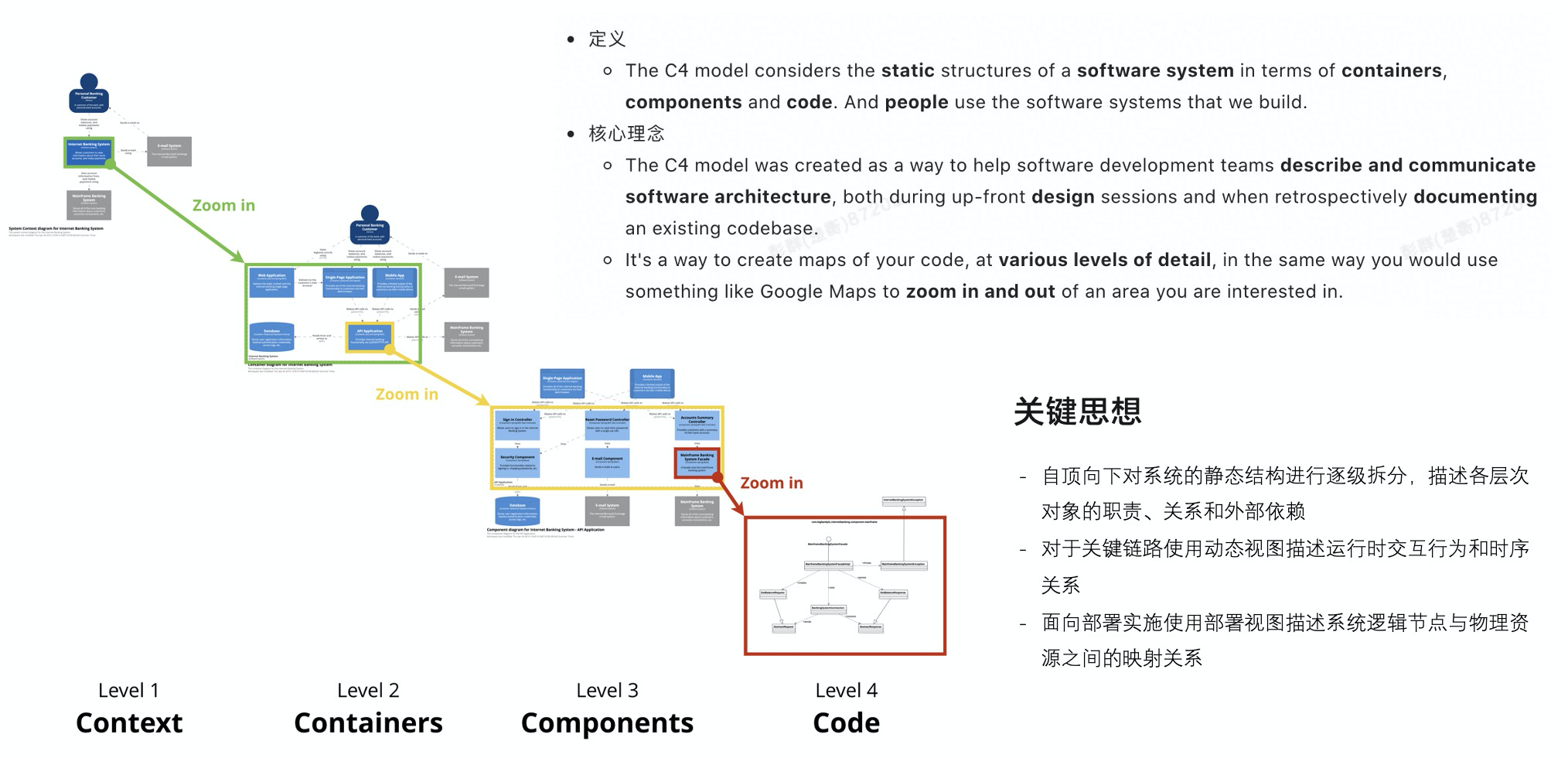 C4 模型通过容器、组件、代码以及人这几个抽象来描述一个软件系统的静态结构,它的核心理念是希望像 Google Map 一样,通过不同层次的细节,为代码建立一种可以放大和缩小的导览图。它最关键的思想就是自顶向下对系统的静态结构进行逐级拆分,依次描述各层次对象的职责、关系和外部依赖。除了核心的层次化静态结构视图,它还可以包含动态视图、部署视图等补充视图。
