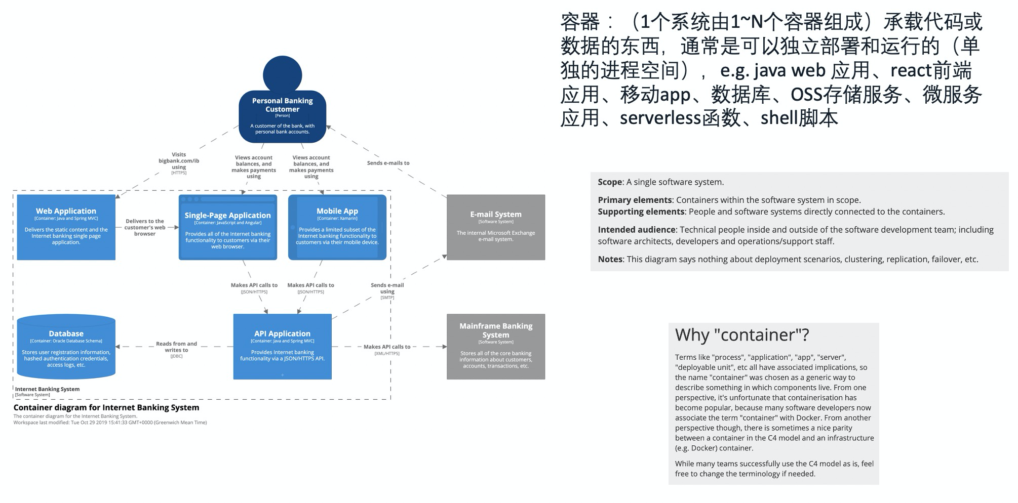 通过 L1 的上下文图理解了系统在整个 IT 环境中的定位后,下一步就是把系统这个框框放大,详细看下其中包含了哪些“容器”(Container,注意不要跟 Docker 容器搞混了噢!)。C4 模型中的容器是指单个应用或数据存储,通常可以独立部署和运行(有独立的进程空间,通过 IPC 机制互相通讯),例如:SpringBoot 微服务、React SPA、移动 App、数据库、Serverlss 函数、Shell 脚本。