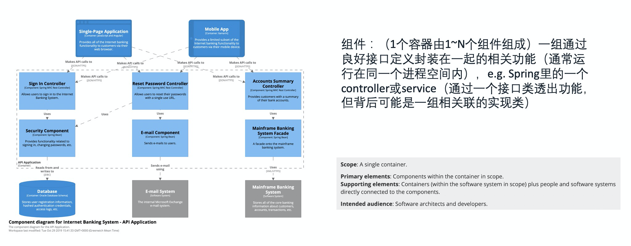 与容器图类似,L3 的组件图也不只包含了容器的组件划分,还包括各个组件的职责定义、技术与实现细节等。随着层次的下沉和细节的增多,组件图的受众范围进一步缩窄,一般只适用于软件架构师和开发者(其他角色没必要理解,一般也理解不了)。