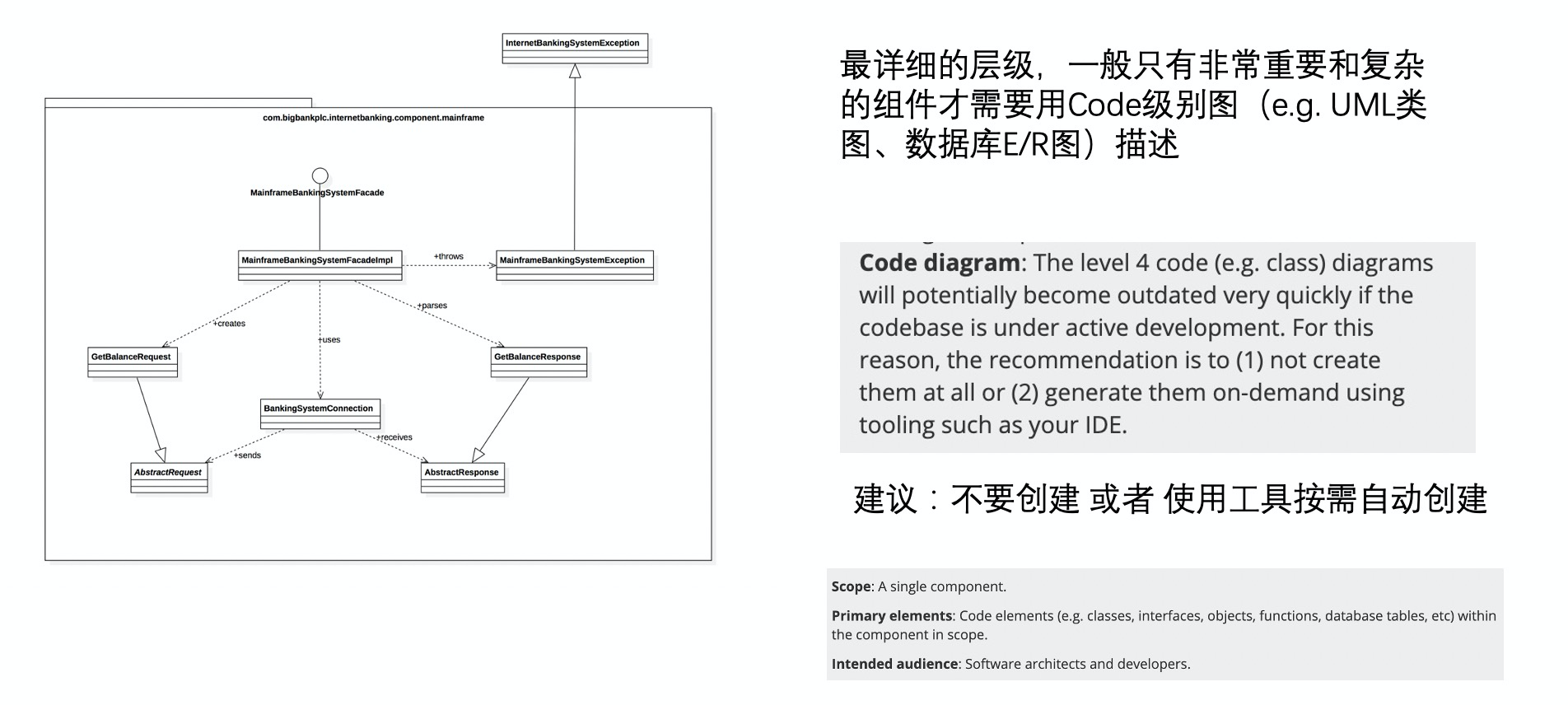 再继续对组件进行放大,所能看到的最底层和细节的信息,就是 L4 的代码(Code)了。当然,这里所谓的“代码”还是以图的形式(e.g. UML 类图、数据库 E/R 图)展示类或文件粒度的代码结构,并不是真正的代码本身。即便如此,代码图在 99% 的架构描述场景下也依然过于详尽,一方面数量庞大,绘制成本很高;另一方面易于变化,维护成本也非常高。因此,一般只有非常重要和复杂的组件才需要用到这一层级进行描述。如果确实需要绘制,也应该优先考虑自动化的方式,比如很多 IDE 就支持自动生成 UML 类图。