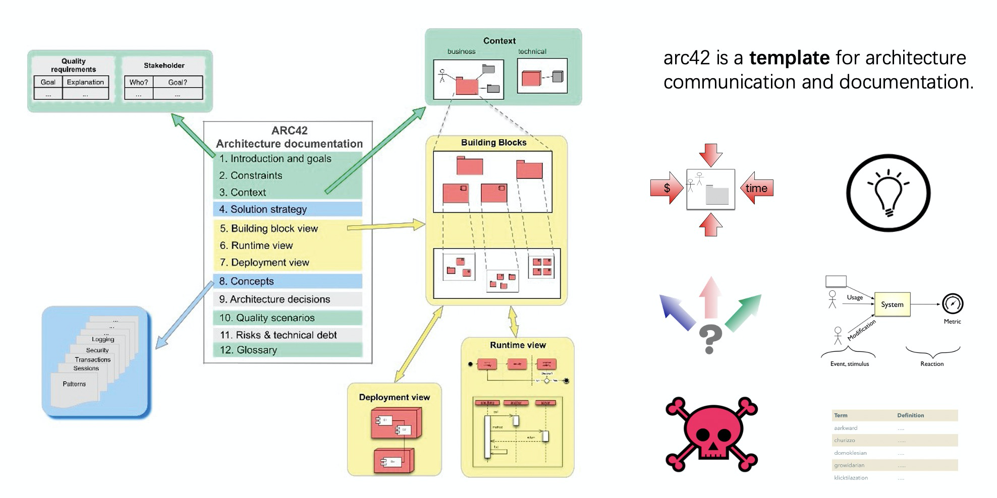 伟大的思想都是相似的,arc42 也不例外。上方左图的右侧部分,概括了 arc42 模板中与制图相关的几个核心章节,分别是: