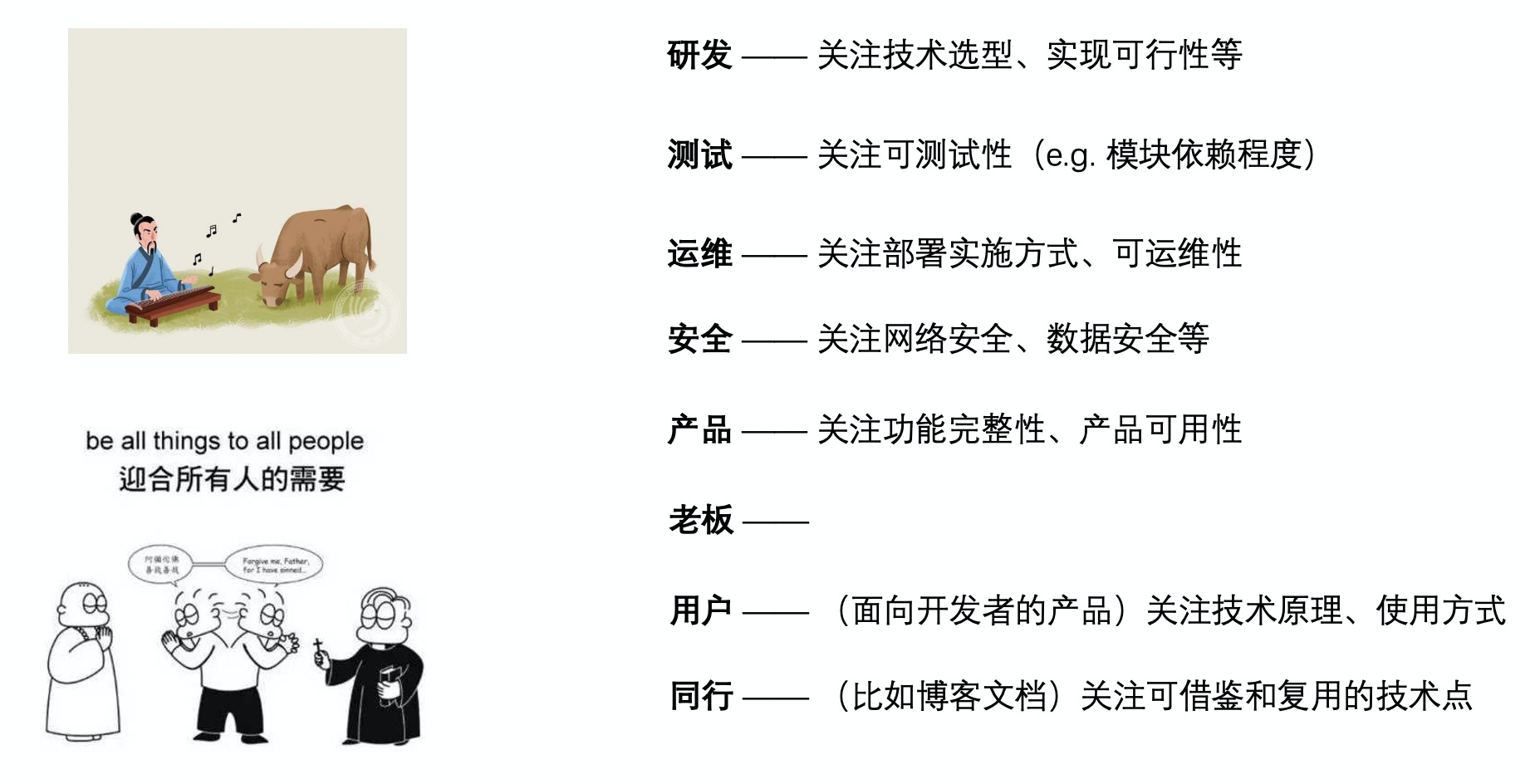 - 研发:一般会关注很多实现相关细节,比如技术选型、实现可行性、可维护性等,毕竟他们是架构的最直接消费者;