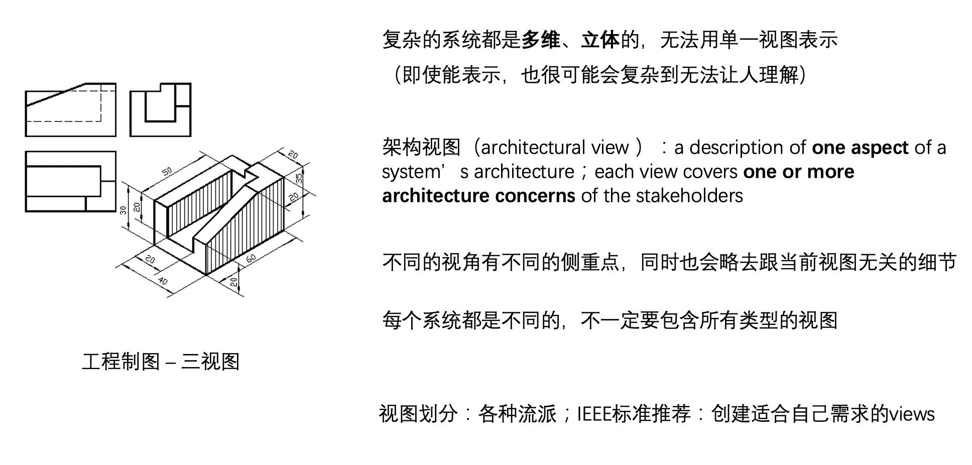 架构制图的第四要点,是在向传统的工程制图方法论致敬:使用多种架构视图来描述你的架构。在工程制图的世界里,任何立体的制品,大到机床小到零件,都至少需要通过三种视图(主视图、俯视图、左视图)来描述。作为现实世界的映射,软件系统也是多维和立体的,只用单一视图不可能覆盖所有关键的架构信息;即使强行把这些信息都塞在一张图里,那也一定会复杂到让人无法理解。