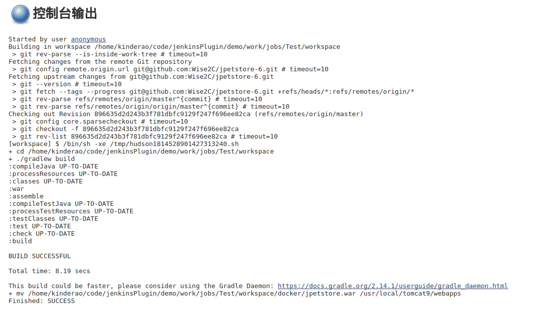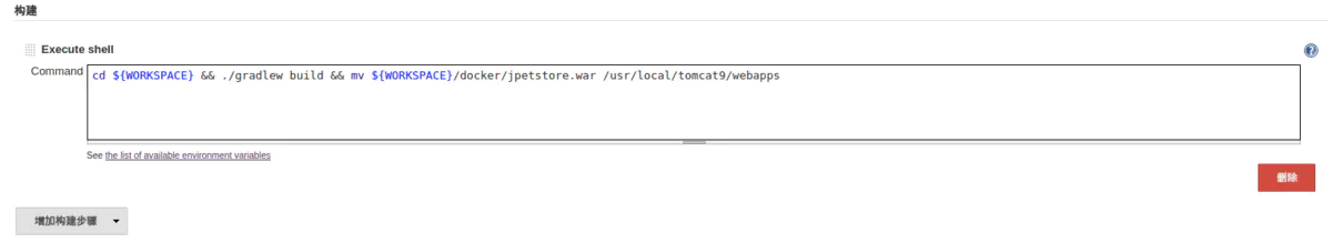 cd ${WORKSPACE}WORKSPACE是jenkins的定义的环境变量,代表该项目对应的文件路径,该项目检出的源码也是该目录。类似的环境变量还有BUILD_NUMBER, BUILD_ID, JOB_NAME, JENKINS_HOME等等./gradlew build使用gradle 执行构建命令,将检出的源码编译打包为war包,这里我们使用的构建工具是gradle,如果是使用maven,可以mvn clean packagemv {WORKSPACE}/docker/jpestore.war /usr/local/tomcat9/webapps/