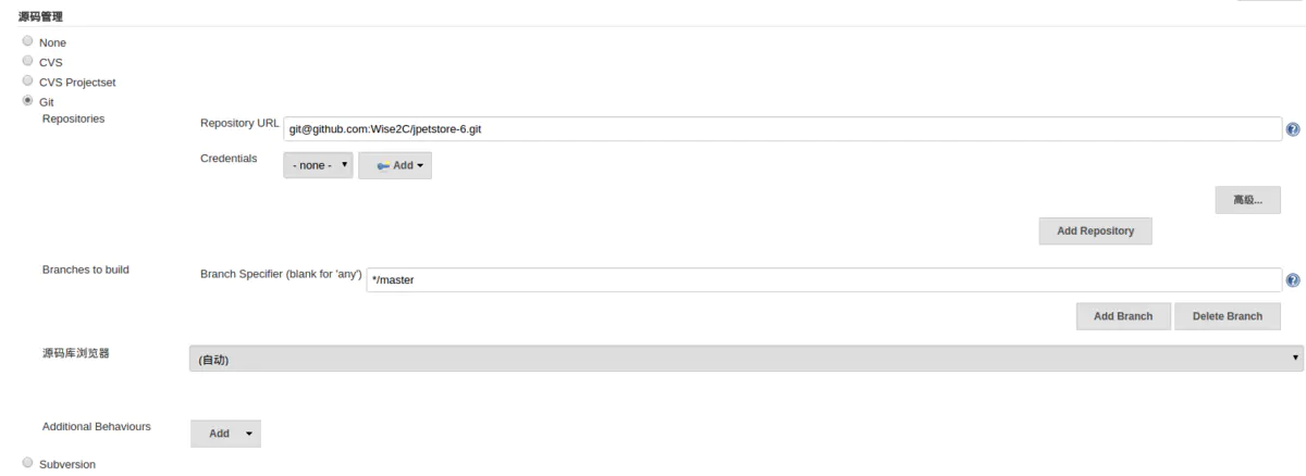 将源码信息配置上去,我选择一个github上面的项目,如果源码管理中没有git这个选项,只需要到系统管理中添加git这个插件即可