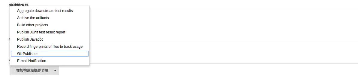 Publisher:Publisher代表一个项目构建完成后需要执行的步骤,如选项中的E-Mail Notifaction就是一个Publisher插件,选择这个选项后,当项目构建完成,就会使用email来通知用户,假如想要在项目构建完成后将构建目标产物发送到服务器上,则可以扩展此扩展点。