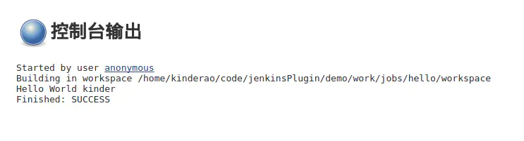 如上面的代码所示,在perform方法中我们通过listener打印了一行”Hello World“ + name,name是一个变量,这个变量的值从哪里来下面我会介绍一下给大家。在web界面上的控制台可以看见 Hello World kinder,而kinder这个值是由我们自己定义的。