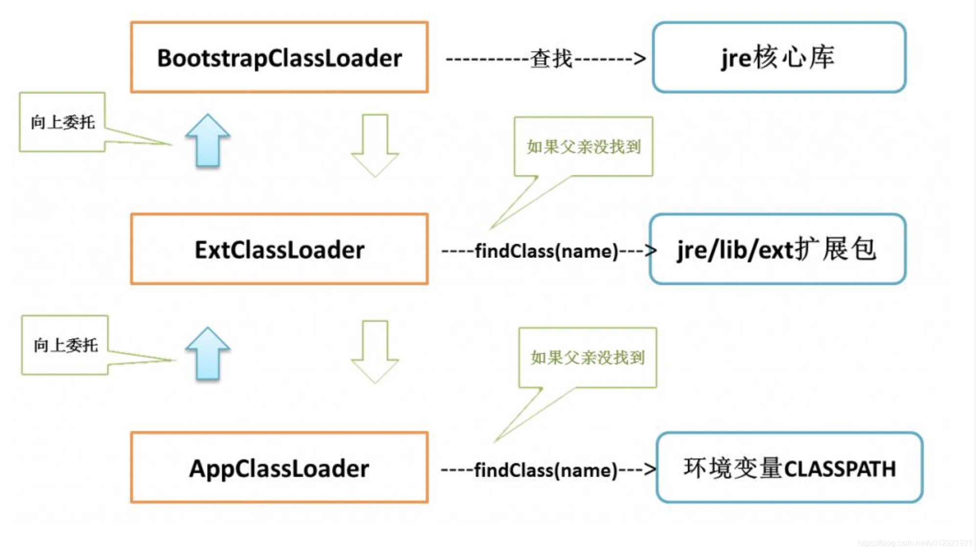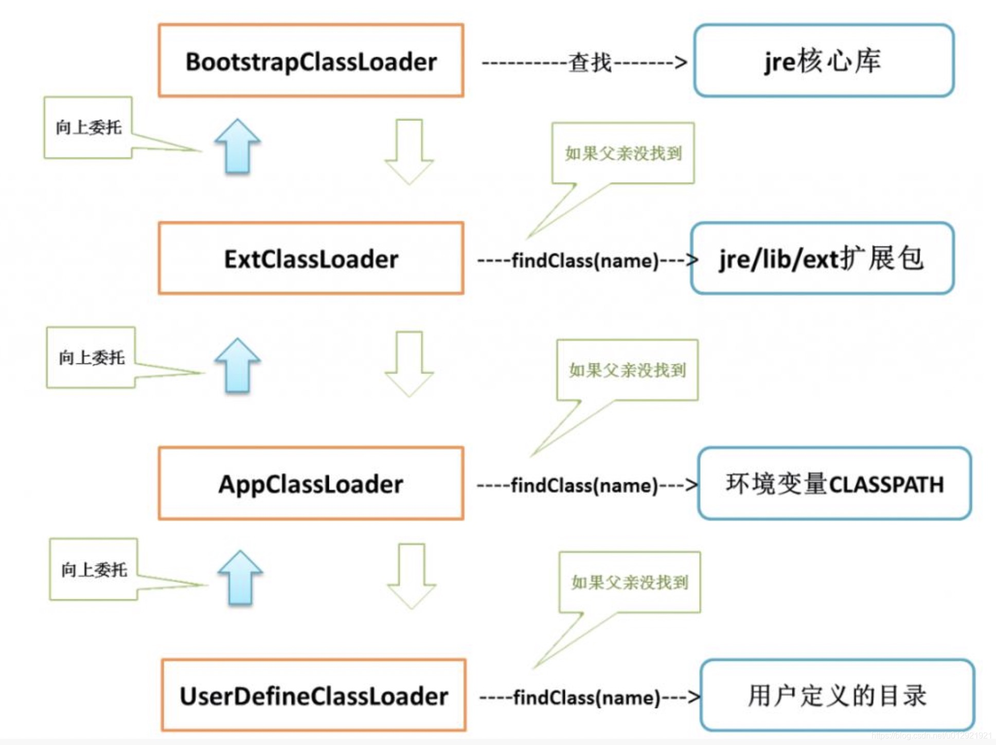 //在父类加载器无法加载的时候,再调用本身的findClass方法来进行类加载