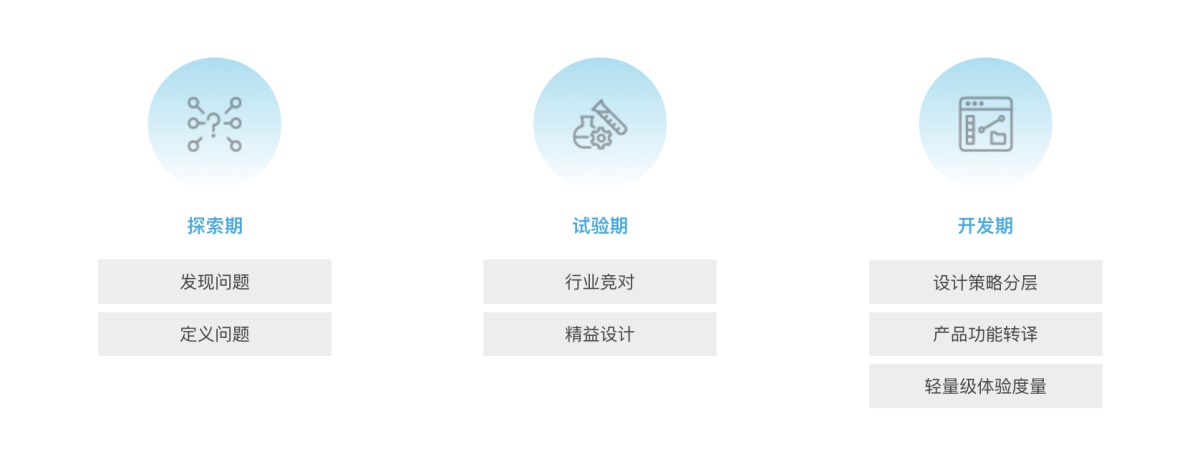 根据项目不同时期的侧重点,我将把整个项目的实践拆分为3个时期进行介绍,分别是探索期、实验期和开发期。「设计框架」中包含的设计方法也将围绕不同时期的侧重点进行展开。