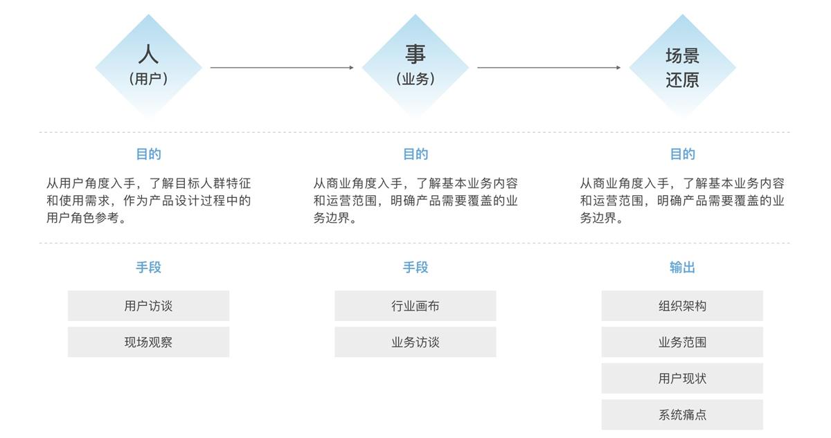从「用户(人)」的维度发现问题,是为了理解业务人员组织架构;明确公司内部自上而下对产品期待;以及终端用户的核心诉求。我们主要是通过访谈和观察法进行数据收集,确保获得一手的资料。