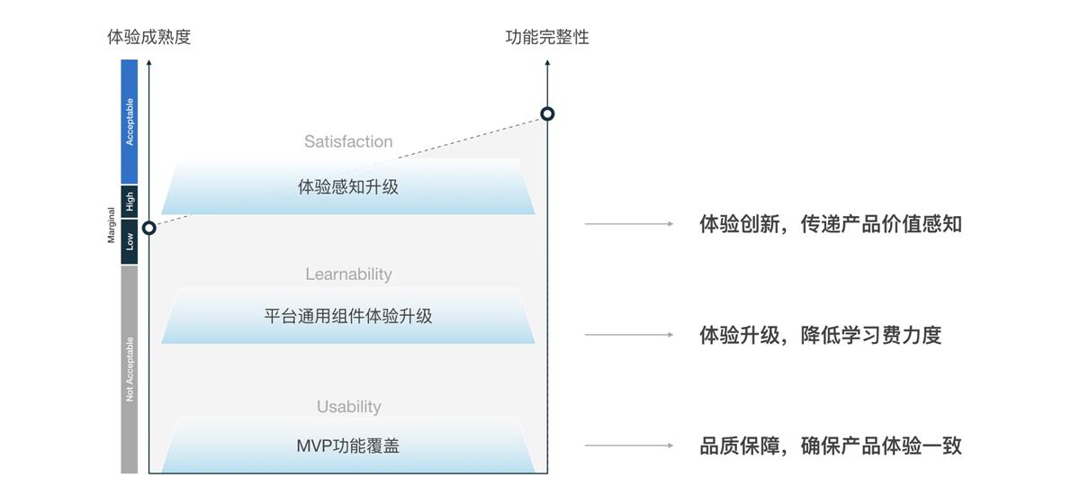 需要结合产品的生命周期进行设计目标的拆解。我们项目的目标就是成功迁移产品。并且产品目前现有1.0版本已经在公司内部运营了2年,基础功能已经覆盖。但为了结合 Lazada 的业务场景需要更深一步的功能定制。结合现状,设计在不同的产品阶段有以下如图所示的策略分层。