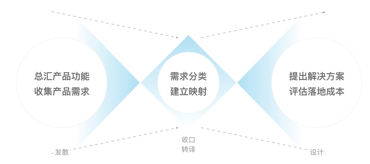 在 MVP 功能覆盖阶段,设计输出主要包括对设计需求的探索和转译。在设计转译的拆解思路上,我主要关注通用功能和定制功能之间的融合和落地。抽象来看,从0到1的融合转译过程就像是一个由大到小再变大的沙漏。