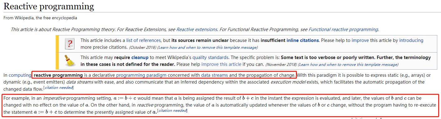 reactive programming is a declarative programming paradigm concerned with data streams and the propagation of change响应式编程(reactive programming)是一种基于数据流(data stream)和变化传递(propagation of change)的声明式(declarative)的编程范式