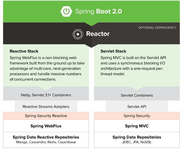 Spring 5提供了一整套响应式(非阻塞)的技术栈供我们使用(包括Web控制器、权限控制、数据访问层等等)。 - 而左侧的图则是技术栈的对比啦;