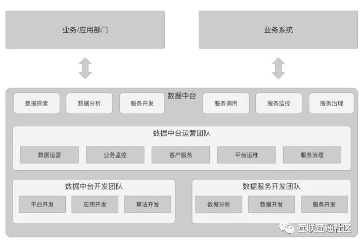 数据中台是距离业务更近的能力平台,数据中台是一个需要持续运营的数据服务业务平台,所以数据中台的团队不仅仅是一个技术团队,应该将数据中台当做一个产品团队来构建,整体的结构如下: