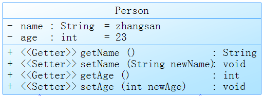 在Java类中可见性分为三类,分别是private,public 和protected,在类图中分别用符号-、+和#表示。通用表示方法中名称就成员变量的名字,类型就是成员变量的类型如String类型,int类型等,当然也可以是自定义类型。而后面的默认值是可选参数,如果我们没有给成员变量设置初始值,UML类图中就不显示,如上面Person类图,变量name,age没有设置初始值,如果此时我们给name和vaule分别设置默认值zhangsan,23。则UML类图如下