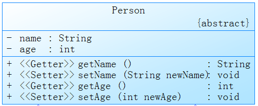 顾名思义就是类的名字,对应于Java类中的类名,如果该类是抽象类的话,在类名右下角会有一个(Abstract)表示,假如Person是一个抽象类的话,则UML类图如下