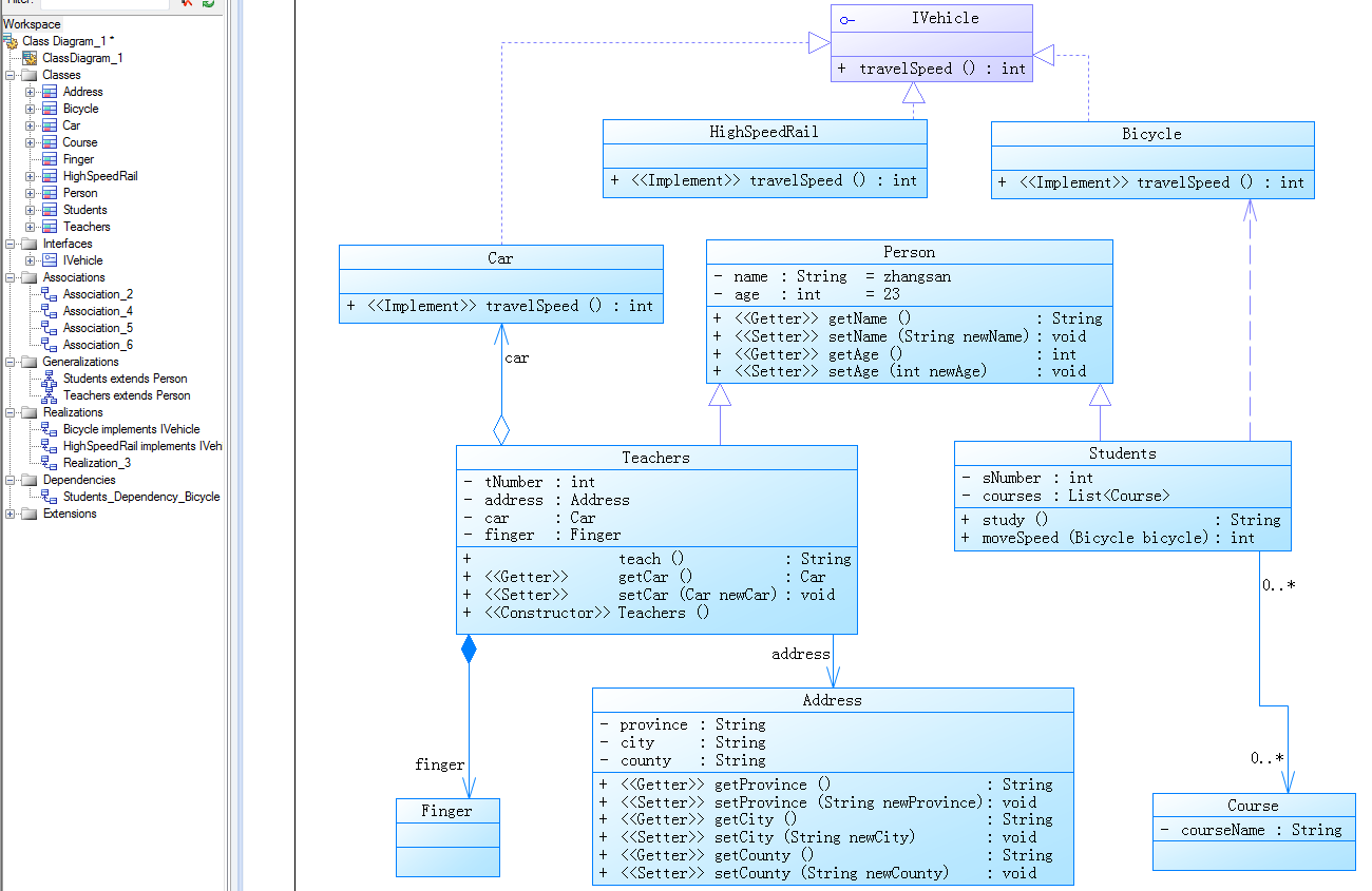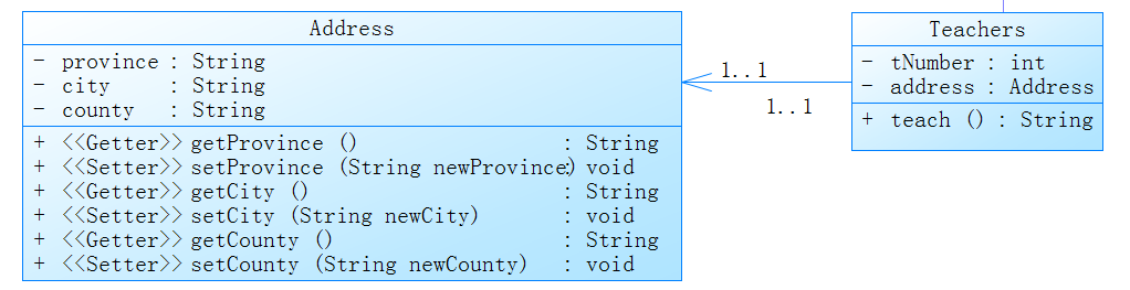 关联关系表示一个类和另一类有联系,例如在上面的举例中每个Teachers都有个家庭住址与之对应,而此时Teacher和Address就形成了一对一的关联关系。如下