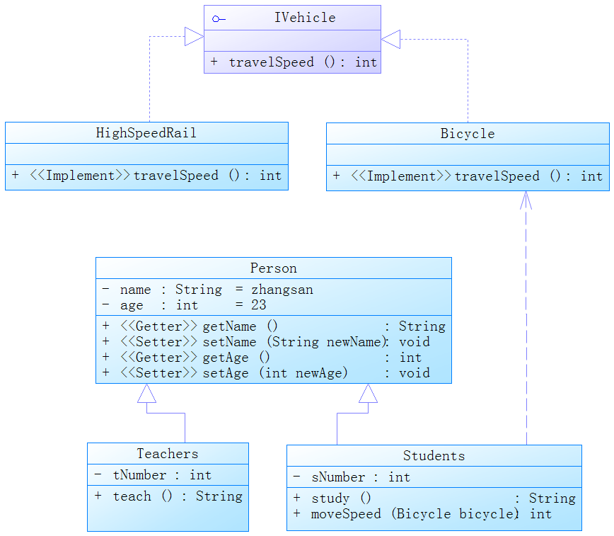 依赖关系是类与类之间最弱的关系,依赖可以简单的理解一个类使用了另一个类,这种使用关系具有临时性特征,但是一个类又会由于另一个类的改变而受到影响,例如在上面举的例子中,假如我们的Students类拥有一个Bicycle,那么要获取移动速度则需要使用Bicycle中获取速度的方法travelSpeed()方法。此时Students代码如下