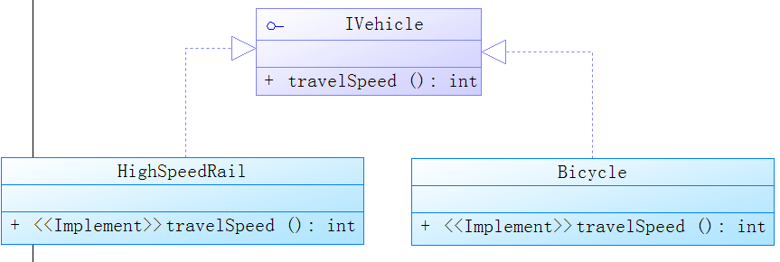 实现关系在java中就是一个类和接口之间的关系,接口中一般是没有成员变量,所有操作都是抽象的(abstract修饰),只有声明没有具体的实现,具体实现需在实现该接口的类中。在UML中用与类的表示法类似的方式表示接口,区别可在UML中类图中看出。如我们创建一个交通工具类接口IVehicle,并有一个形式速度方法声明travelSpeed,Java代码如下