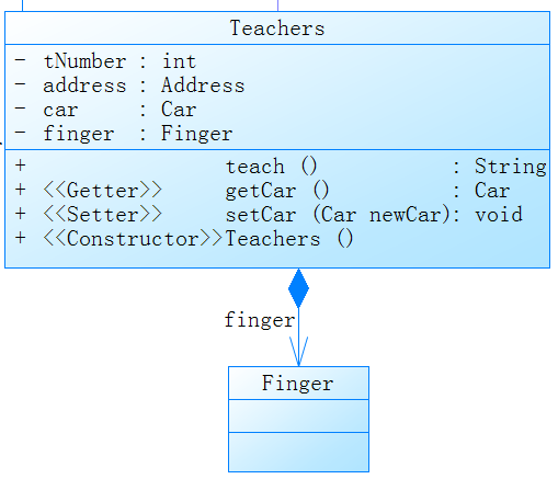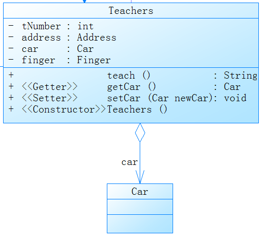 聚合关系是表示整体与部分的关系,但是部分可以脱离整体而存在。例如一个Teachers对象有一辆汽车Car,此时Car就是Teachers的一部分,但是Car可以脱离Teachers而存在。在UML类中聚合关系用带空心菱形的直线表示。