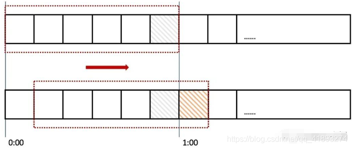 (2)滑动窗口算法,就能降低临界问题的影响,它的基本原理就是将一个时间窗口进行分割,比如将 1 分钟的时间窗口分割成 6 格,则每格代表 10 秒钟,且每一格都有自己独立的计数器。每过 10 秒钟,就把整个 1 分钟的时间窗口往右滑动 1 格。而时间窗口内的总计数,则是将该窗口内的所有格子的计数总和出来的。如下图所示: