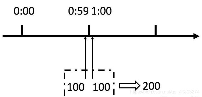 (1)计数器算法,也称为固定窗口算法,比较简单粗暴,就是在固定的时间周期内(即时间窗口)累加访问次数,当达到设定的阀值时,触发限流策略,比如拒绝请求。下一个周期开始时,进行清零,重新计数。这个算法虽然简单,但存在一个严重的问题,那就是临界问题。假设 1 分钟内服务器的负载能力为 100,因此一个周期的访问量限制在 100,然而在第一个周期的最后 1 秒(0:59)和下一个周期的开始 1 秒(1:00)时间段内,分别涌入了 100 的访问量,虽然没有超过每个周期的限制量,但是整体上 2 秒内已达到 200 的访问量,已远超过服务器的负载能力。如下图所示: