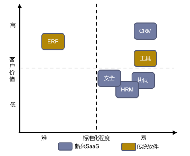 国内知名的证券与投资机构,东兴证券的分析师认为,企业数字化的应用场景众多,可以分成两个维度进行衡量与归类:一个维度是SaaS工具带给客户的价值;另一个则是将其做成标准化的难易程度。