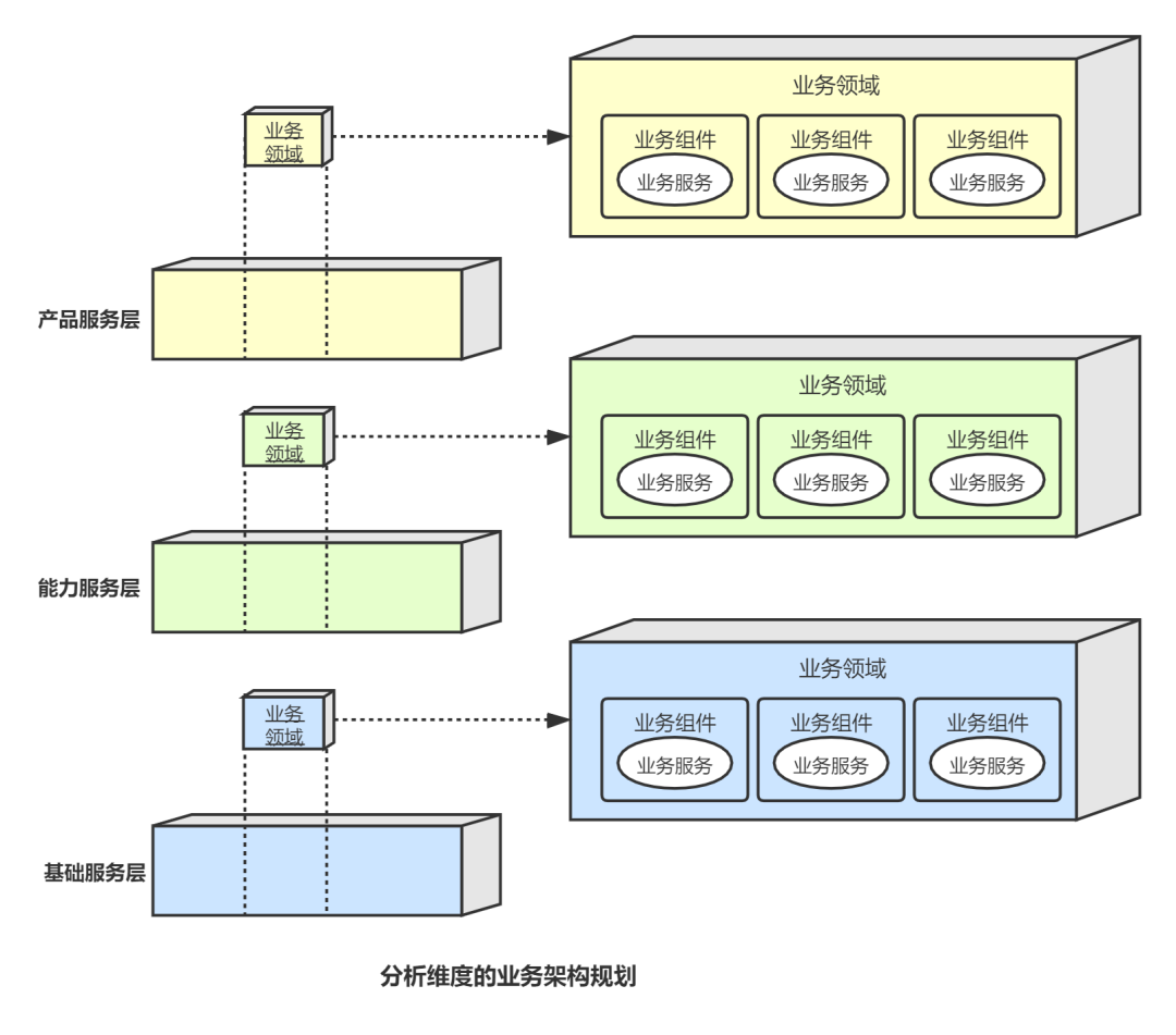 领域维度的判断依据是领域价值的高低,商业维度的主要判断依据是变化速率和规划愿景,它们共同映射为不同服务层次进行规划的业务架构,最后从分析维度对每个服务层次的业务逻辑进行切分与细化,为业务架构映射为应用架构提供落地实现的基础。