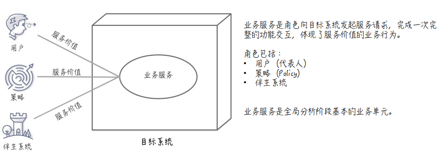 业务架构的业务服务“表示显式定义的暴露业务行为,代表了用于实现组织内外客户需求的服务,并处理主体与主体之间、主体和客体之间的连接物”。这一定义没有清晰地说明业务服务到底是什么,也没有明确划分依据,无法确定其设计粒度。我在《解构领域驱动设计》一书中明确指出了业务服务的定义,即它是“角色主动向目标系统发起服务请求,完成一次完整的功能交互,体现了服务价值的业务行为”,如下图所示: