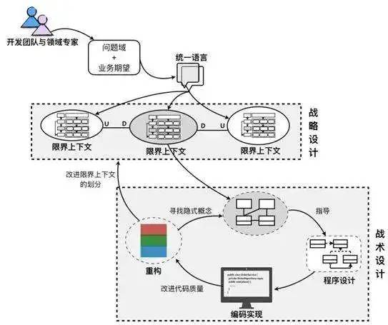 在战略设计阶段 ,面对纷繁复杂的业务需求,领域专家和研发团队进行紧密合作、充分沟通,进行事件风暴或场景驱动设计,分析需求并提炼知识,得到比较清晰的问题域,输出由领域专家和研发团队达成共识的统一语言(UL,Ubiquitous Language),基于统一语言对问题域进行分析和建模,识别业务边界,确定限界上下文,根据限界上下文划分独立的领域,建立限界上下文彼此之间的关系,接着引入系统上下文(System Context)确定系统的边界,并确定它的外部环境,包括与其集成的第三方系统与基础设施。利用 DDD 分层架构或六边形架构界定业务领域和技术实现的边界,让稳定的核心领域模型处于架构的最内部,避免技术实现和架构变动带来的影响。