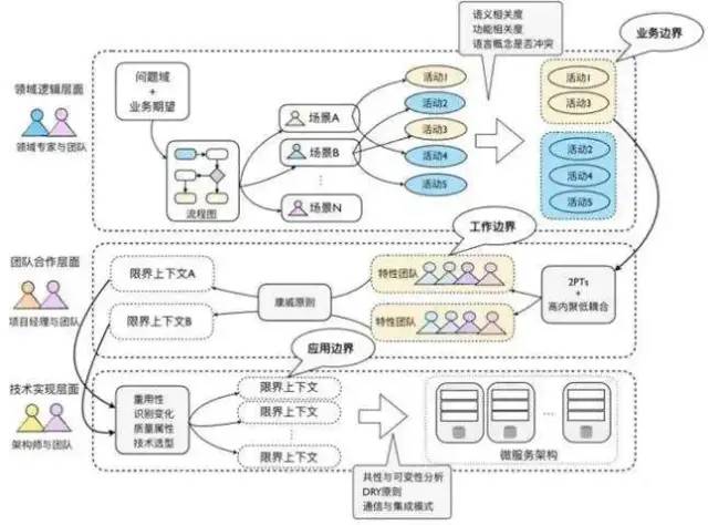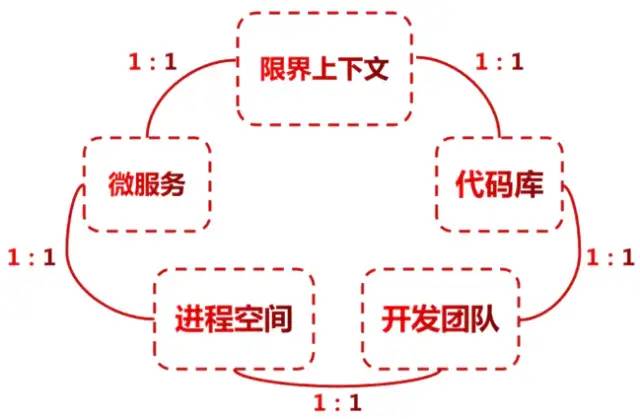技术架构层面:限界上下文确定了系统架构的应用边界,保证了系统层和上下文领域层各自的一致性,建立了上下文之间的集成方式。微服务中,限界上下文指导技术人员划分微服务的边界,通常一个限界上下文作为一个在独立进程中运行的微服务。