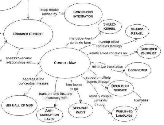 限界上下文仅是一种对领域问题域的静态划分,还缺少一个重要的关注点,即:限界上下文之间是如何协作的?当我们发现彼此协作存在问题时,说明限界上下文的划分出现了问题,也是识别限界上下文的一种验证方法。Eric Evans 将这种体现限界上下文协作方式的要素称之为“上下文映射(Context Map)”,并给出了 9 种上下文映射关系: