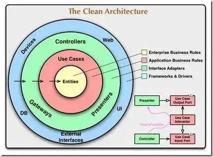 整洁架构中,同心圆代表应用软件架构的不同部分,也是一种以领域模型为中心的架构,从里到外依次是 Entities、Use Cases、Interface Adapters、Frameworks and Drivers。整洁架构明确了各层的依赖关系,越往里,依赖越低,越抽象,外圆代码依赖只能指向内圆,内圆不知道外圆的任何事情。