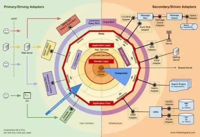 六边形架构的内部六边形、DDD 分层架构的领域层和应用层、以及整洁架构 Use Cases 和 Entities 区域实现了核心业务逻辑。但是核心业务逻辑又由两部分来完成:应用层和领域层逻辑。领域层实现了最核心的业务领域部分的逻辑,对外提供领域模型内细粒度的领域服务,应用层依赖领域层业务逻辑,通过服务组合和编排通过 API 网关向前台应用提供粗粒度的服务。业务需求变幻莫测,但我们总能在这些变化找出一些规律,用户体验、操作交互、以及业务流程的变化,往往只会导致 UI 层和流程的变化,总体来说,不管前端和外部如何变化,核心领域逻辑基本不会大变。把握好这个规律,我们就知道如何设计应用层和领域层,如何进行逻辑划界了。架构模型正是通过分层方式来控制需求变化对系统的影响,确保从外向里受的影响逐步减小。面向用户端的展现层可以快速响应外部需求进行调整和发布,灵活多变;应用层通过服务组合和编排实现业务流程的快速适配上线,以满足不同的业务场景;领域层是经过抽象和提炼的业务原子单元,是非常稳定的。这些架构设计的好处是可以保证领域层的核心业务逻辑不会因为外部需求和流程的变动而调整,对于建立前台灵活、中台稳固的架构能力是很有好处的。下面是 Herberto Graca 的一张包含了六边形、整洁、CQRS 等架构的综合图,全面的说明了这些架构的设计要点和不同的出发点。
