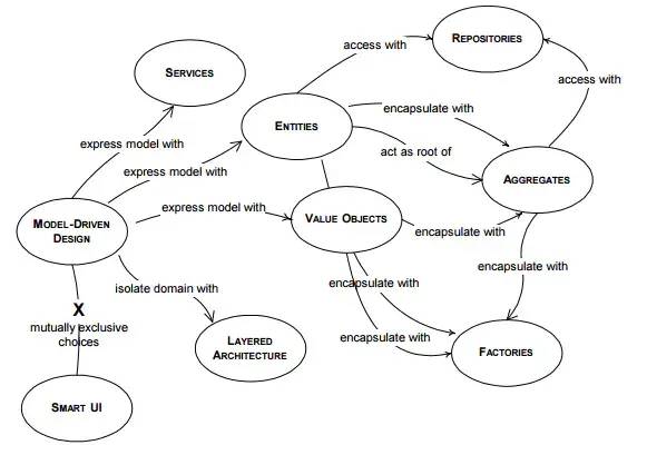 战略设计为我们提供一种高层视角来审视我们的软件系统,而战术设计则将战略设计的成果具体化和细节化,它关注的是单个限界上下文内部技术层面的实施。DDD 给我们提供了一整套技术工具集,包括实体、值对象、领域服务和资源库等,如下: