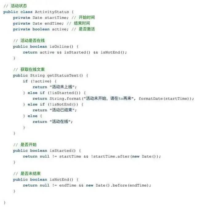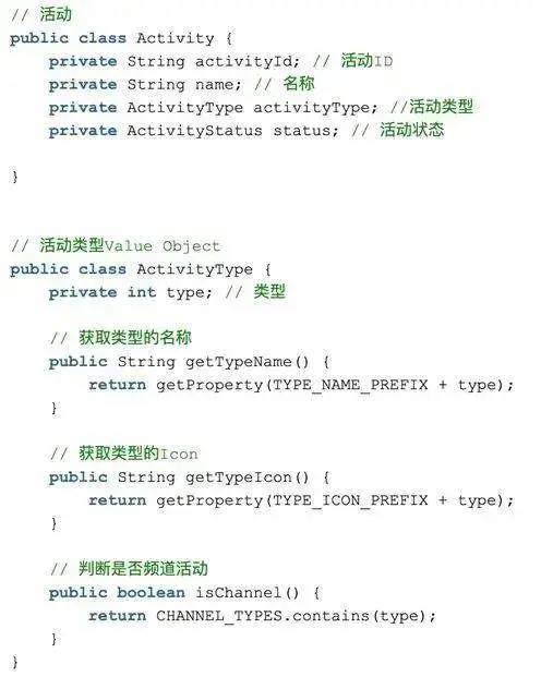 让隐性的概念显性化(Make Implicit Concepts Explicit)通天塔活动类型就是一个简单的 int 类型,属于隐式概念,但活动类型包含了很多相关业务逻辑,比如类型名称,不同类型活动具有独特的 Icon,判断活动类型是否是判断等,我们把活动类型显性化,定义为一个 Value Object。