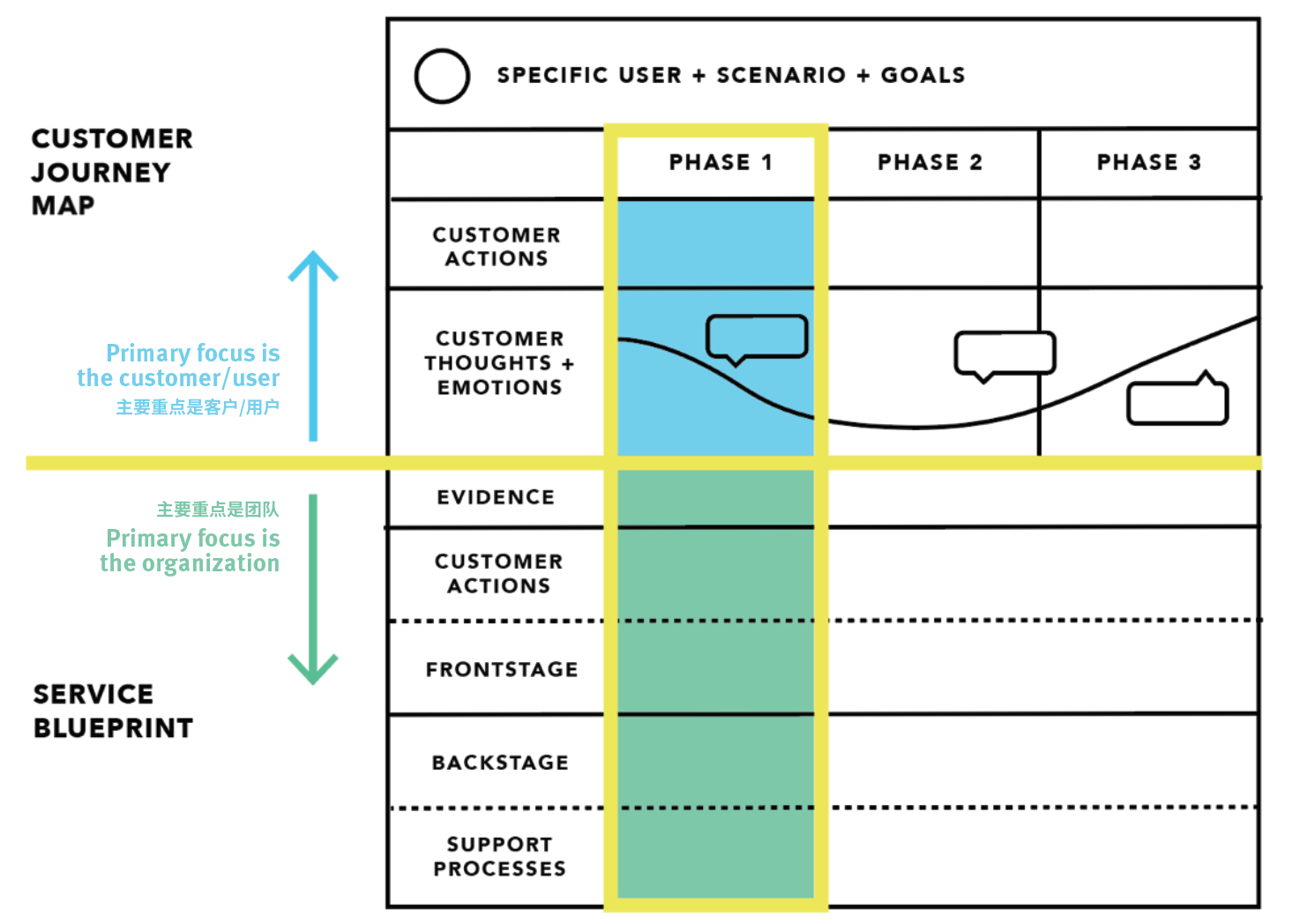 用户旅程图的主要重点是了解有关最终用户的更多信息,而服务蓝图的重点是记录团队如何创建这种体验。