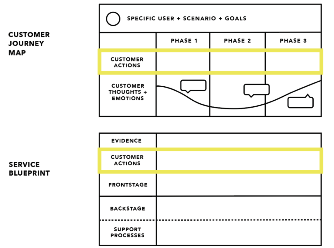 用户旅程图和服务蓝图有共同的组成部分。例如,如果二者都基于相同的角色,并且具有相同的范围,那么在用户客户旅程图和服务蓝图中,顾客行为将相同。但是其他区域会有所不同。