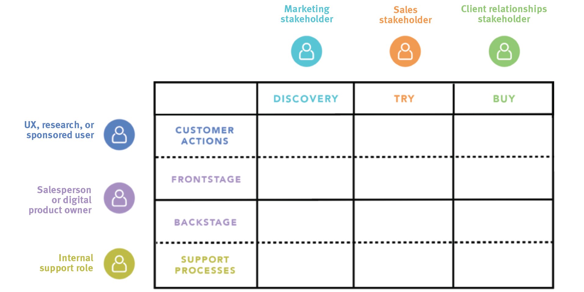 因此,应该参与涉及用户旅程这一方面的每个内部部门的利益相关者或团队成员,每个部门都包括与最终用户非常熟悉的参与者,以及前台和后台参与者。